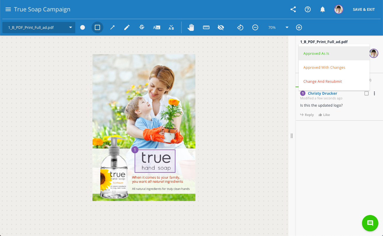 such as ‘Approved as is’ or ‘Change and resubmit.’ You can set the approval status by selecting the drop down menu on the right hand side of the screen, above the collaboration panel. Available status options are chosen by the proof uploader.