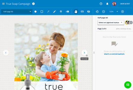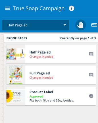 The Page Navigator shows all creative assets in the proof and allows you to navigate to other pages by clicking on the corresponding thumbnail. This is also a great place for an at-a-glance view of each page’s status based on the stage of the review. Before you submit your own approval statuses, it will show your selected page status. After your review has been submitted, it will show the aggregate status of each page.