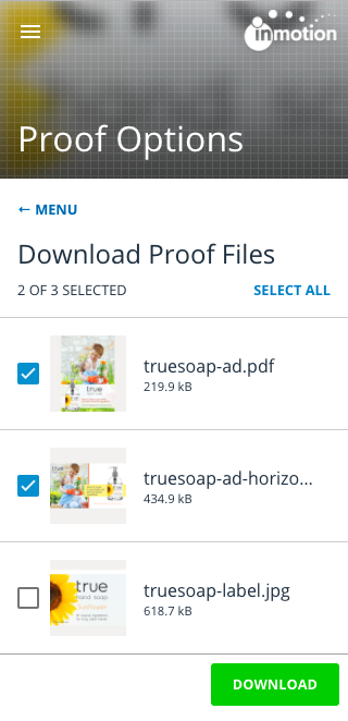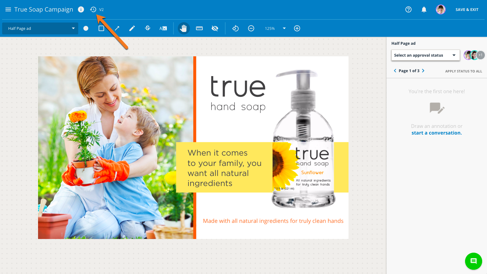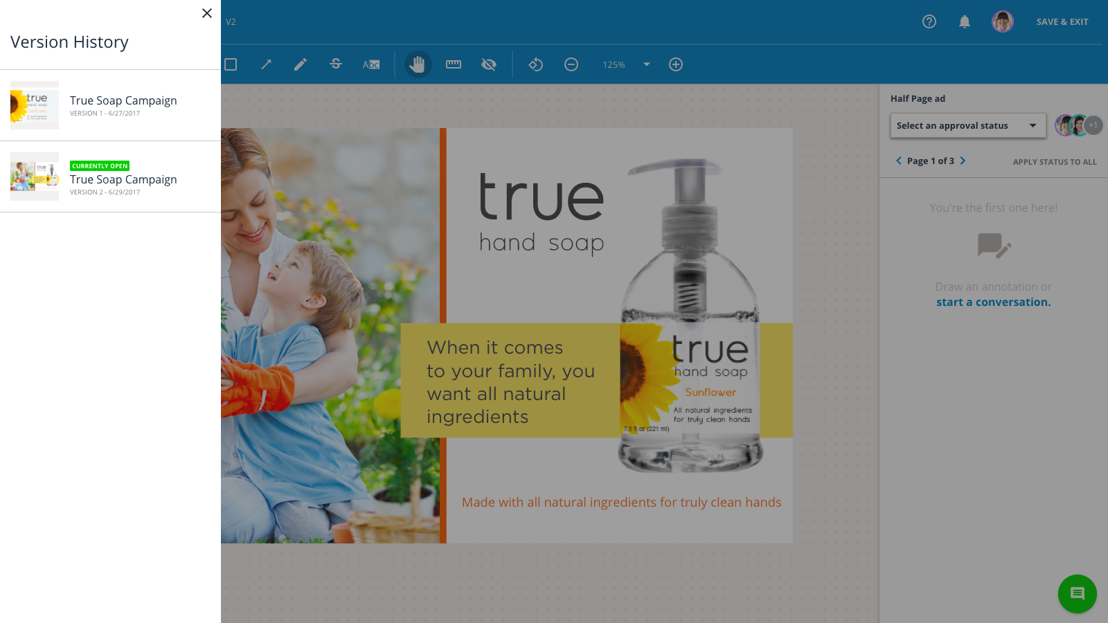 inMotion allows for the proof uploader to submit sequential versions of the same document, so that after implementing feedback in their design, these versions will be associated together, and comparable in the review environment.