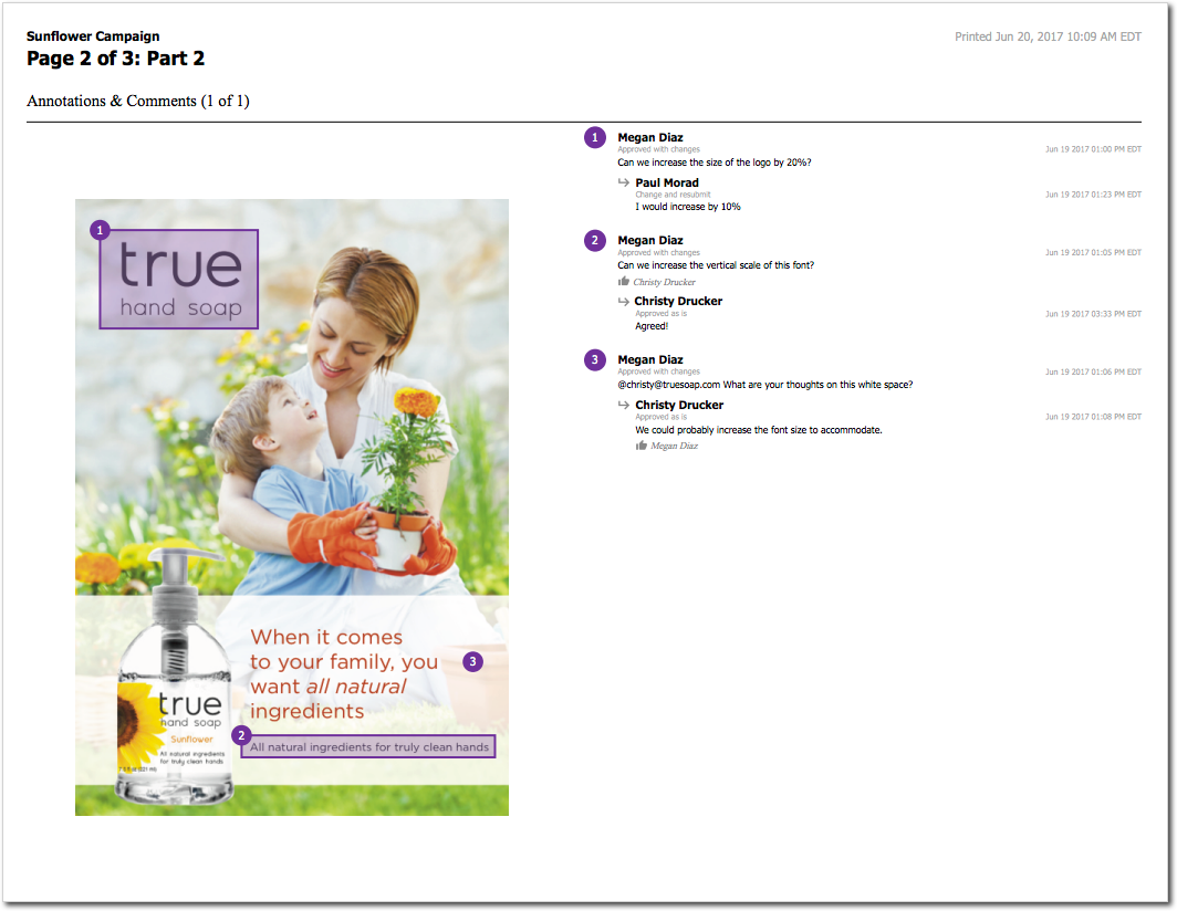 Print allows you to print the proof to PDF. Banners will appear at the bottom of the review environment indicating PDF preparation and readiness. The generated PDF file will include a cover page including grouped approval statuses, images of the assets with annotations alongside reviewer collaboration.