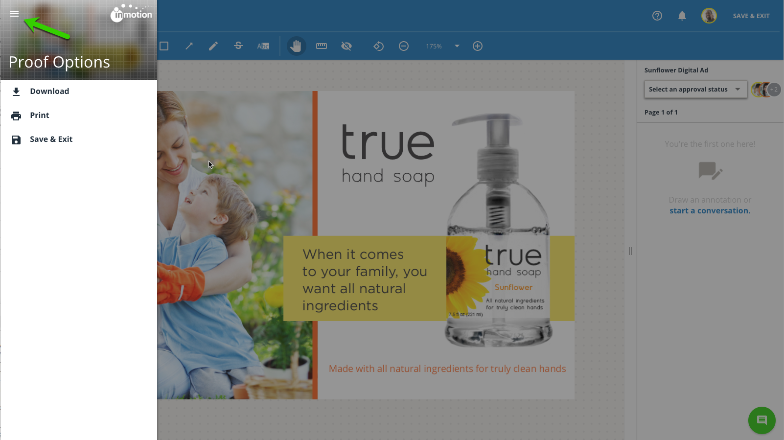 Select the menu icon in the top left corner of the review environment to view available proof options.
