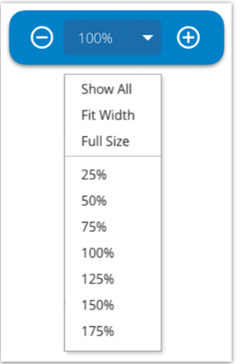 The Zoom Tool allows you to zoom in and out on the asset. You also have ‘Show All,’ ‘Fit Width,’ ‘Full Size,’ and various zoom percentages for viewing the asset. The maximum zoom percentage level is based on your choice of browser.
